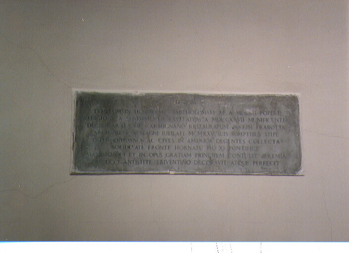 - ISCRIZIONI DOM/ TEMPLUM IN HONOREM BARTHOLOMAEI AP. A MDLVII POPULI/ RELIGIONI A FUNDAMENTIS EXCITATUM A MDCCXXVII MUNIFICENTIA/ DUCIS CARAFA DE CARMIGNANORESTAURATUM IOSEPH FRABOTTA/ ARCHIPRESB A MAGNI IUBILAEI MCMXXV SUIS SUMPTIBUS PTIPE/ INTER OPPIDANOS AC CIVES IN AMERICA DEGENTES COLLECTA/ SOLIDITATEFRONTE HORNATU PIO XI PONTIFICE/ MAXIMO QUI ET IN OPUS GRATIAM PRINCIPEM CONTULIT/ [G]EREMIA PASCUCCI ANTISTITE TRIVENTINO DECORAVIT ATQUE PERFECIT - lettere capitali - a incisione -