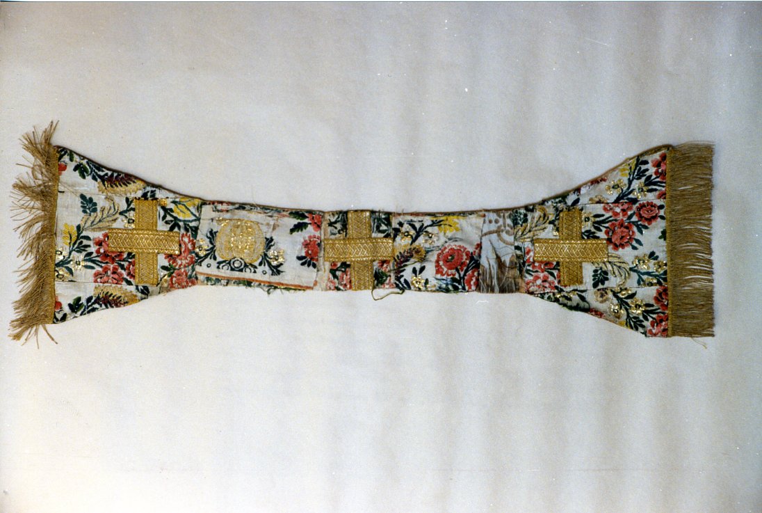manipolo in taffetas di seta ricamata a fili colorati e dorati con galloni ricamati a filo d'oro