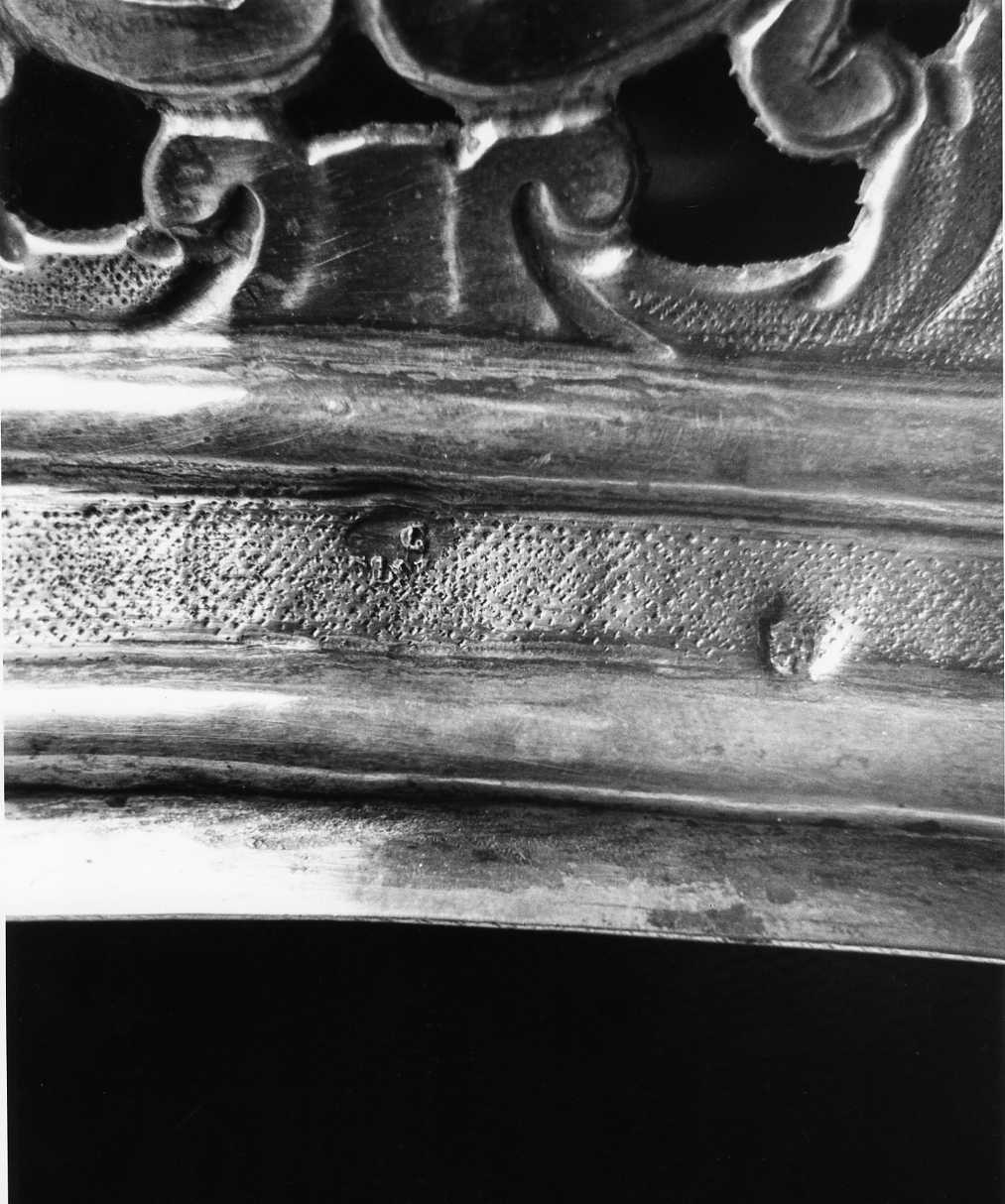 - NOTIZIE STORICO CRITICHE Non è stato possibile individuare, con un certo margine di sicurezza, l'identità dei due punzoni posti sul cerchio della corona, per cui si è optato, per le linee generali, per una cronologia generica da riferirsi al XIX secolo. Si può comunque avanzare l'ipotesi che il punzone con la croce possa essere un punzone non perfettamente riuscito e che manchi della seconda parte, cioè della lettera N affiancata da un numero 7 opp. 8 che era appunto il punzone utilizzato a Napoli solo per gli argenti sacri tra il 1839 e il 1872
