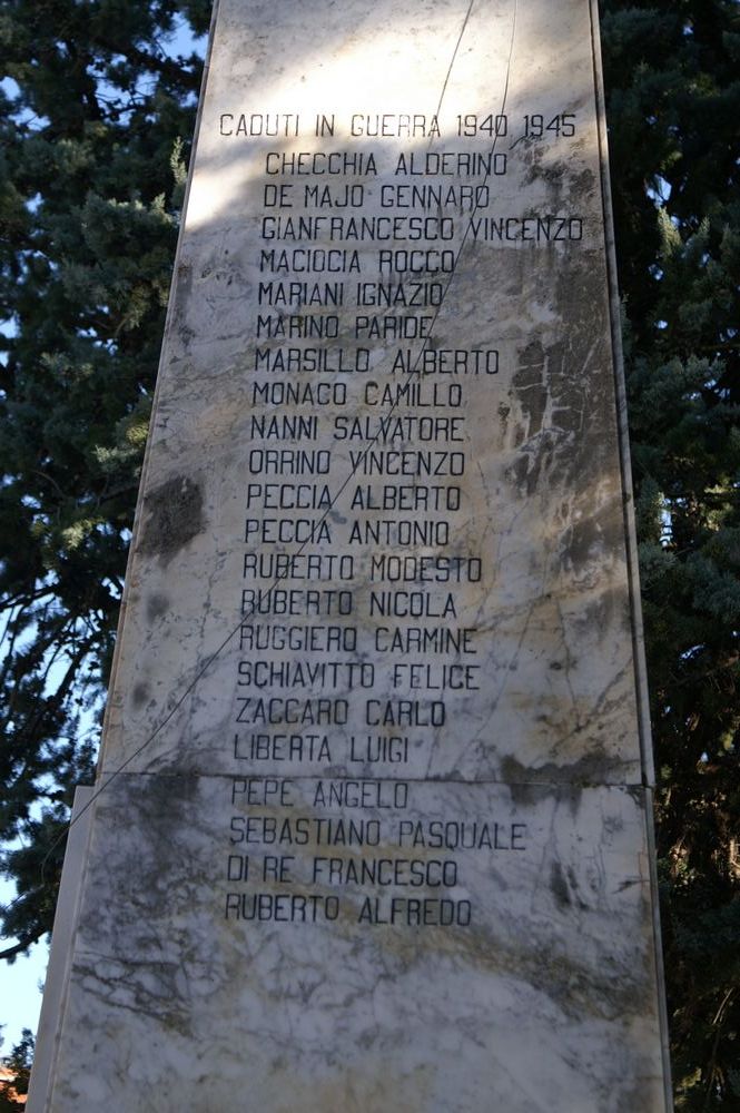 - ISCRIZIONI prospetto principale - CADUTI IN GUERRA 1915 1918/ BRUNETTI GIUSEPPE/ CRIVELLONE ANTONIO/ CUTONE GIOVANNI/ DE LUCIA RAFFAELE/ DE MAJO GENNARO/ DI RE ALFONSO/ GAGLIA ANTONIO/ LIBERTA GIOVANNI/ MASELLA TELESFORO/ MONACO ANGELO/ MONACO PASQUALE/ PECCIA NICOLA/ PERNA FRANCESCO RUBERTO CARLO/ SEMPREVIVO MICHELE/ AVVOLTI NELLA PORPORA DEL MARTIRIO/ CADDERO PER UNA PIÙ GRANDE ITALIA/ NEGLI ANNI 1915 1918 – 1940 1945/ CANTALUPO DEL SANNIO/ AI POSTERI LONTANI TRAMANDA ORGOGLIOSA/ I NOMI - caratteri vari - a bulino -