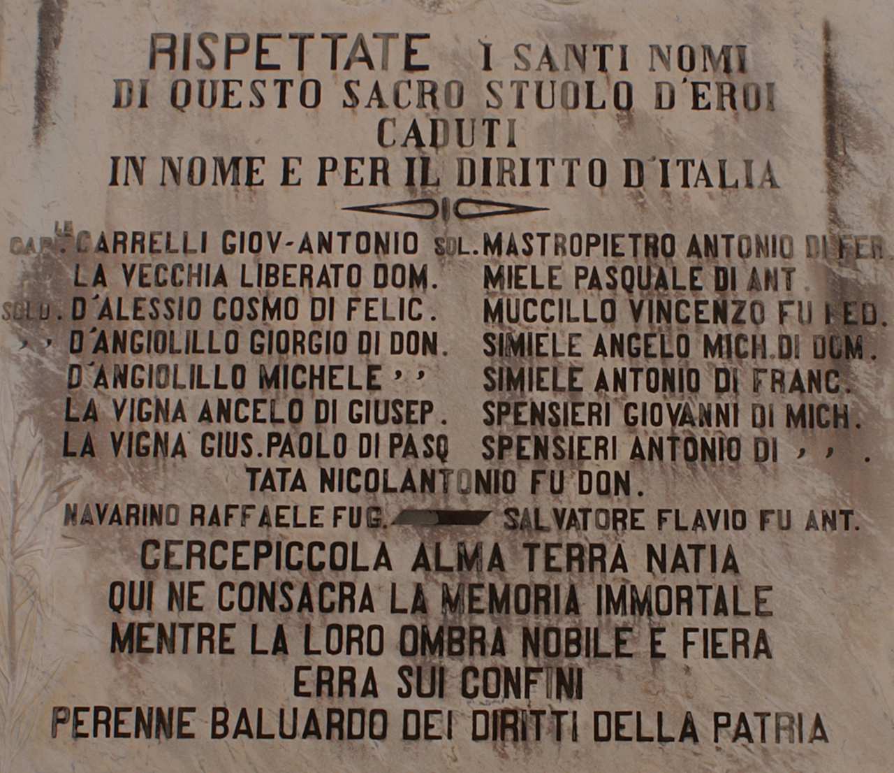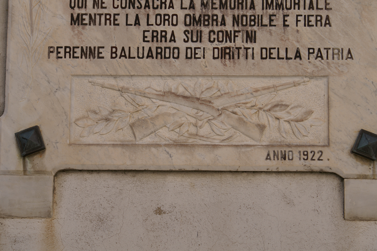 - ISCRIZIONI in alto al centro - RISPETTATE I SANTI NOMI/DI QUESTO SACRO STUOLO D' EROI/CADUTI/IN NOME E PER IL DIRITTO D'ITALIA - capitale - a caratteri applicati in bronzo -