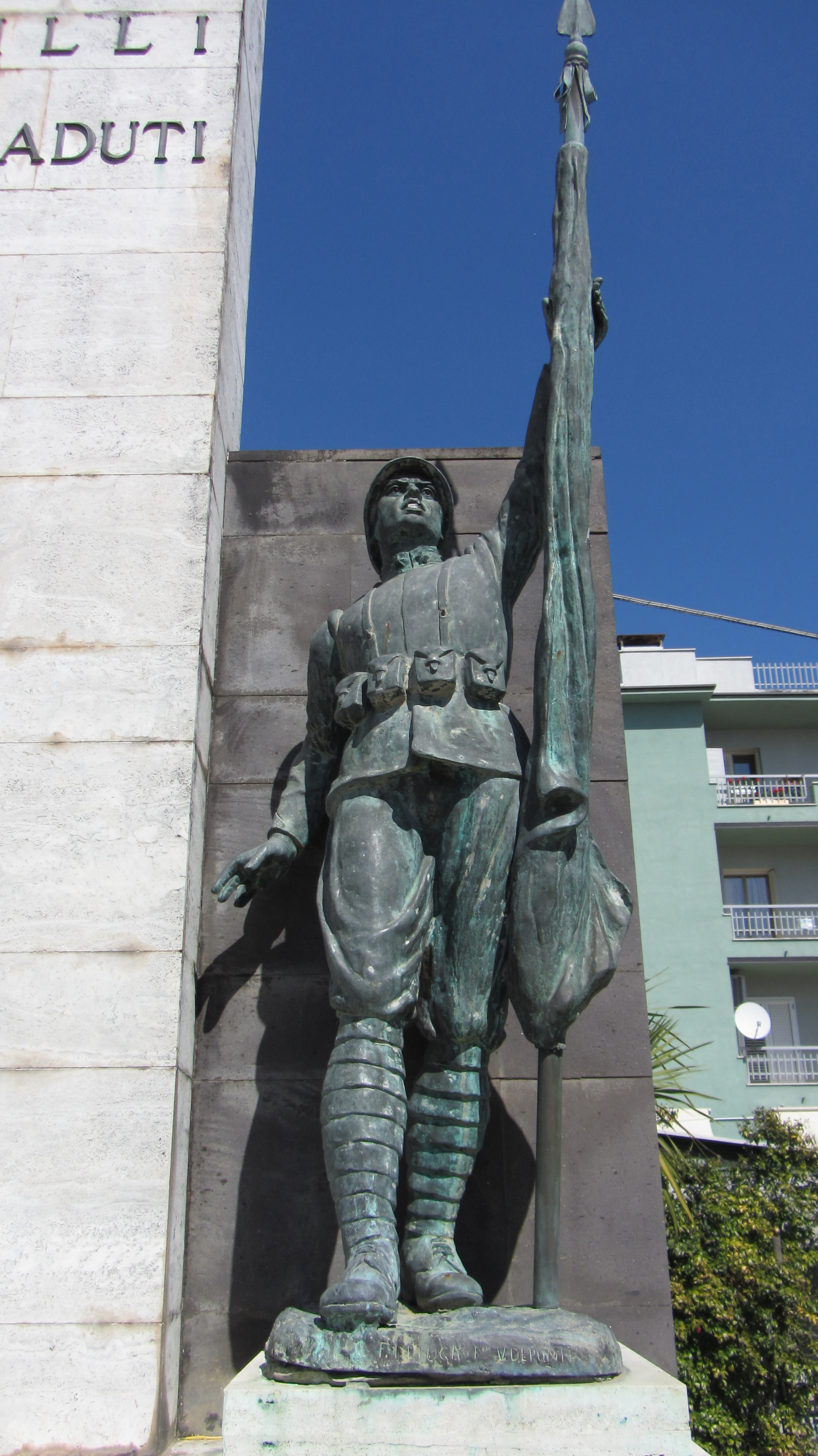 Monumento ai caduti prima e seconda guerra mondiale; tipologia a stele, costituito da una lapide in bronzo e una scultura in bronzo raffigurante un soldato