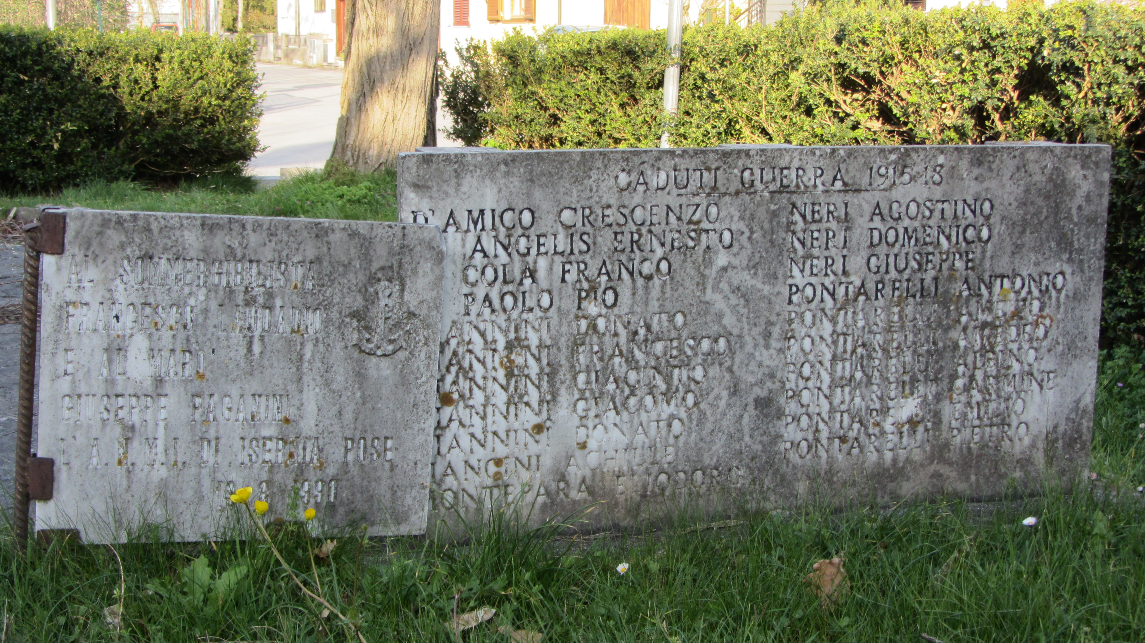 Lapide commemorativa ai caduti nella prima guerra mondiale in marmo bianco, posta nella sistemazione a giardino di Piazza dell'Emigrante. I nomi dei caduti sono incisi a caratteri capitali. Al suo fianco è presente un’altra lapide, decorata in alto a destra da un’ancora, dedicata al sommergibilista Francesco Laudadio e al marò Giuseppe Paganini.Lapide con nomi dei caduti incisi sul marmo
