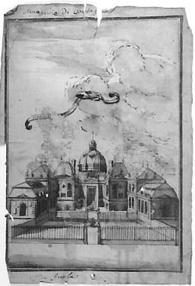 Veduta frontale di un edificio con copertura a cupola al centro e tre corpi quadrangolari per ogni lato. Anteriormente è una corte quadrata chiusa da cancellate metalliche. Il tutto è racchiuso in una bordatura rettangolare