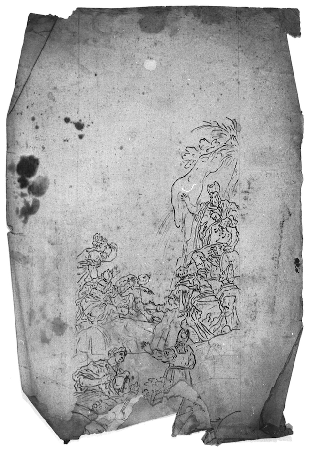 Il foglio è disegnato su entrambi i lati. Recto: una figura sacerdotale (Mosè) predica con la mano alzata su una folla di varie figure. Sullo sfondo è un dirupo dal quale sembrano uscire getti d'acqua. Verso: sviluppato solo nella verticale destra è un disegno di parete o di volta a lacunari quadrati, losanga romboide, motivi floreali in modanature quadrangolari