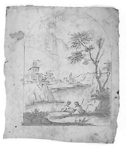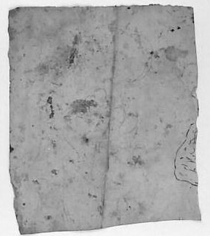 Il foglio è disegnato su entrambe le facce e presenta sul recto una scena di paesaggio con alberi, due figure e, in lontananza, delle case. in alto a sinistra si nota un abbozzo di decorazione vegetale. Sul verso, in basso a destra, una parte di abbozzo di disegno di un braccio