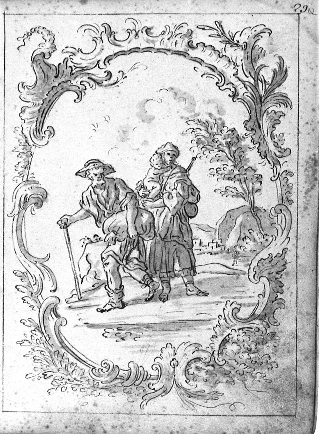 Il foglio di taccuino è disegnato su entrambi i lati. Recto: racchiusa in una cornice con motivi rocaille e fogliacei la scena presenta due figure, un contadino con bastone e sacco e una contadina con bambino, in cammino. Verso:decorazione parietale con, in alto, una specchiatura quadrata con al centro una decorazione mistilinea con intrecci di racemi e serti fioriti
