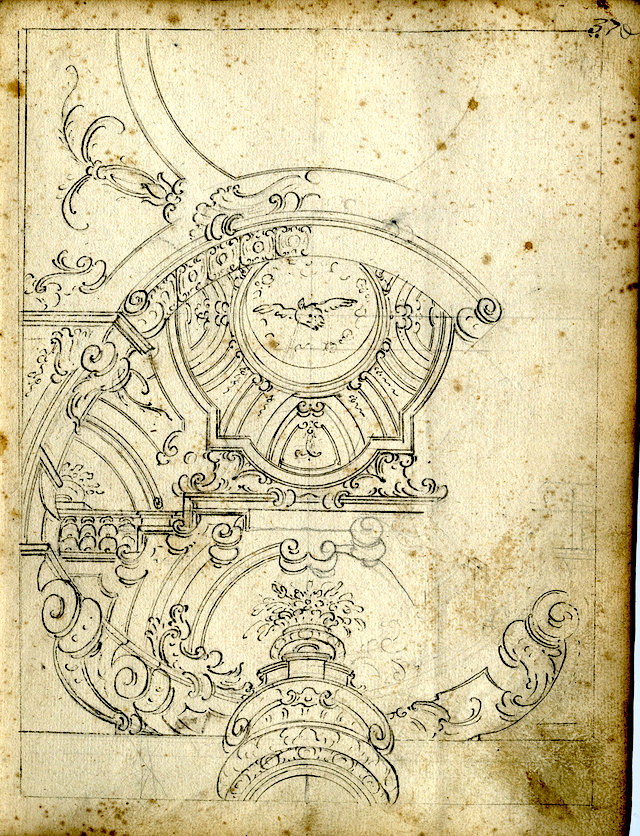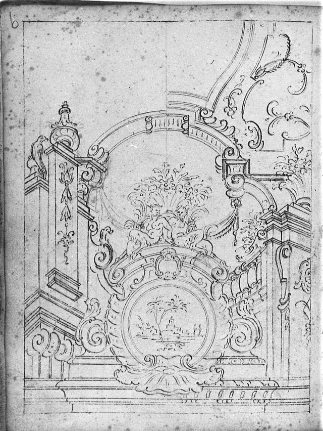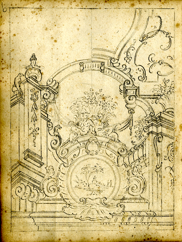 Il foglio di taccuino è disegnato su entrambi i lati. Recto: un arco introduce in una finta volta a catino che presenta al centro uno sfondato circolare con al centro una colomba inquadrata da un'incorniciatura mistilinea. Verso: al centro del disegno è presente una una cornice con decorazione rocaille contenente una paesaggio ed è sormontata da un timpano su cui siedono due satiri. A sinistra si trova un pilastro obliquo con lesena aggettante e a destra un altro pilastro con giara