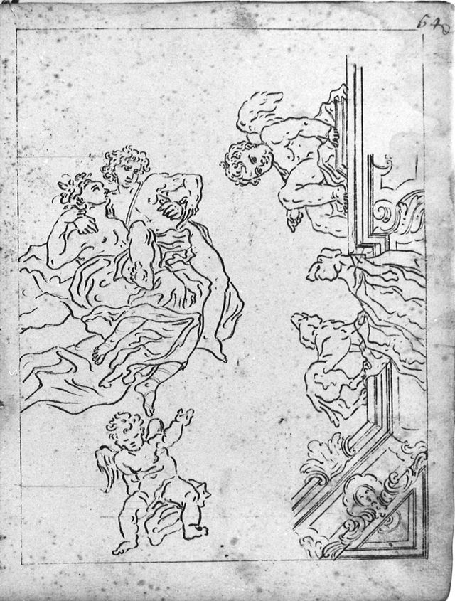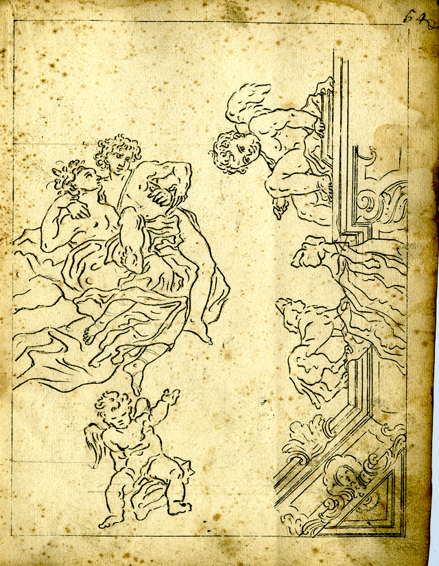 - NOTIZIE STORICO CRITICHE La raccolta, miscellanea di disegni, acquerelli, bozzetti, stampe etc. di vari artisti attivi nei secc. XVII e XVIII, fu recuperata nel 1983 presso le famiglie Iannadrea e Tirabassi, eredi dei Giuliani, Giacomo, padre, e Nicola, figlio, pittori e decoratori di Oratino (CB) operativi in ambito napoletano a cavallo dei secc. XIX-XX. Nicola, allievo di Morelli, la acquisì dagli eredi di Ciriaco Brunetti, pittore e decoratore oratinese attivo in tutto il Molise dalla prima metà del sec. XVIII agli inizi del XIX. Nel 1990 è stata acquistata dal MIBAC e custodita dalla locale Soprintendenza (specifiche dell’atto del 29/10/1990: 375 disegni su fogli singoli; un taccuino di 27 fogli, un taccuino di 21 fogli, un taccuino di 141 fogli, un volume rilegato contenente 54 fogli, 129 incisioni e 24 bozzetti ad olio su tela o cartone). Considerato che su un foglio sono stati realizzati più disegni-bozzetti-schizzi, il fondo è costituito da 700 disegni circa, di cui oltre la metà acquerellati, e da circa 330 stampe, italiane e tedesche, dei secc. XVI-XVIII. La collezione è composta da: disegni raccolti in n. 4 taccuini di Ciriaco Brunetti o Benedetto Brunetti, di varie dimensioni (n. 1 con figure di Santi e n. 3 con progetti per decorazioni); un album rilegato in pelle nel quale sono stati originariamente incollati circa 200 disegni di mani diverse (riportati a singoli foglio dopo il restauro). Vi sono inoltre: circa n. 200 studi per decorazioni in larga parte siglati o firmati da Ciriaco Brunetti; un gruppo di circa n. 70 accademie di nudo riconducibili alla bottega di Francesco Solimena; un gruppo di circa n. 30 disegni a soggetto sacro di Niccolò Falocco, pittore oratinese zio di Brunetti, allievo di Solimena, operativo a Napoli; n. 40 fogli di autori vari di ambito napoletano dei secc. XVI-XVIII (Balducci, Corenzio, Giaquinto etc.). L’importanza del fondo è data dalla sua unitarietà trattandosi di materiale di uso quotidiano, giunto quasi integro fino a noi, di un pittore gravitante in ambito provinciale, la cui produzione superstite è purtroppo oggi riconducibile solo ad una serie di dipinti, conservati in chiese molisane. Testimonia, inoltre, non solo la quotidiana, costante attività del Brunetti nell’ambito dei soggetti decorativi, ma anche l’operosa attività di una bottega oratinese in cui praticavano più esponenti dello stesso ambito familiare (Pietro, Beniamino, Benedetto e Stanislao Brunetti). Le opere, restaurate per oltre il 50% in tre fasi, dal 1992 al 1995 dai restauratori C. L. B. Borruso e P. Crisostomi, sono state custodite presso i depositi della Soprintendenza fino al 2015 anno di definitiva collocazione presso Castello Pandone di Venafro, dove, a rotazione, fanno parte dell’esposizione permanente del Museo. I tre Taccuini di progetti per decorazioni conservati nella Collezione costituiscono un vero e proprio campionario di modelli decorativi e figurativi da proporre ai committenti e desunti dallo studio di stampe e modelli francesi e tedeschi a disposizione degli artisti tra Seicento e Settecento. Il presente Taccuino, inventariato con il numero 34432 all’interno della collezione, è composto da 54 fogli rilegati con laccio di cuoio, a cui si aggiunge un foglio sciolto ritenuto pertinente al bene. I fogli sono disegnati su entrambi i lati e mostrano diverse possibilità di soluzioni decorative per interni di carattere profano. Molti sono i progetti per soffitti con finte architetture prospettiche e fregi di raccordo fiorati. Ma altrettante sono le proposte decorative per pareti, definite “muraglie” sul disegno, che fanno riferimento ad ambiti formali e decorativi diversi: da quelle squisitamente rocailles, con cornici mistilinee in cui si inseriscono elementi paesaggistici, a quelle di gusto già neoclassico con elementi decorativi lineari e geometrici. Molti sono i fogli raffiguranti soluzioni per sovrapporte nelle quali cornici a rocaille inquadrano scene di genere (animali e scene di vita campestre) o serie di allegorie riguardanti le quattro stagioni o gli elementi della natura. Nel complesso si tratta di un oggetto di grandissimo rilievo storico e artistico per la sua rarità, essendo uno degli unici esemplari del genere conservato in ambito meridionale. L’esecuzione del Taccuino, considerata l’omogeneità e la qualità stilista dei disegni, è comunemente attribuita da Giovanni Borrelli, nelle schede, e da Gian Giotto Borrelli, nel catalogo della mostra, a Ciriaco Brunetti e collocato cronologicamente alla metà degli anni Sessanta del XVIII secolo
