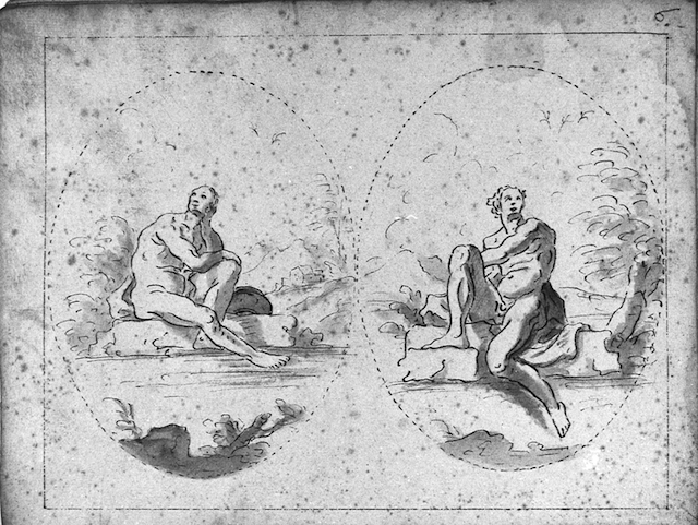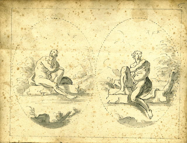 Il foglio di taccuino è disegnato su entrambi i lati. Recto: il disegno mostra a sinistra due figure di uomo e di donna abbracciate e avvolte in un drappo. A destra frontone con due cani e in basso un piccolo putto seduto. Verso: in due ovali tratteggiati sono raffigurate due figure mschile nude sedute su massi