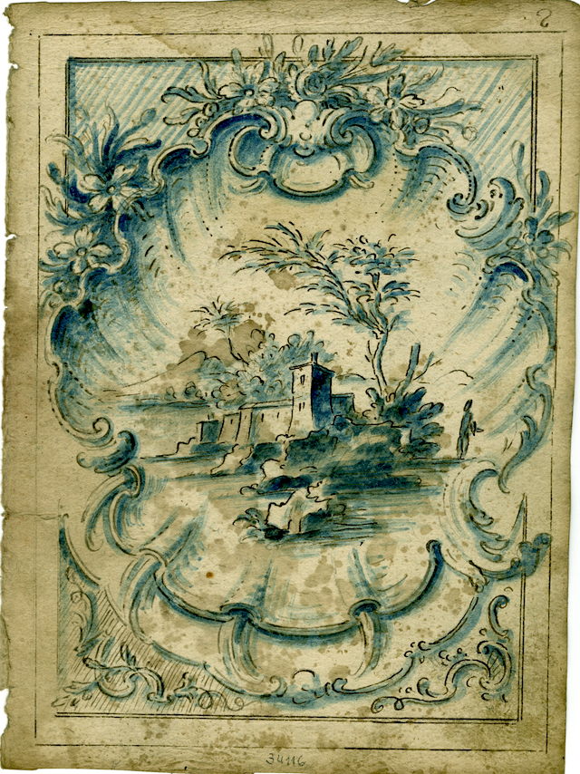 - NOTIZIE STORICO CRITICHE La raccolta, miscellanea di disegni, acquerelli, bozzetti, stampe etc. di vari artisti attivi nei secc. XVII e XVIII, fu recuperata nel 1983 presso le famiglie Iannadrea e Tirabassi, eredi dei Giuliani, Giacomo, padre, e Nicola, figlio, pittori e decoratori di Oratino (CB) operativi in ambito napoletano a cavallo dei secc. XIX-XX. Nicola, allievo di Morelli, la acquisì dagli eredi di Ciriaco Brunetti, pittore e decoratore oratinese attivo in tutto il Molise dalla prima metà del sec. XVIII agli inizi del XIX. Nel 1990 è stata acquistata dal MIBAC e custodita dalla locale Soprintendenza (specifiche dell’atto del 29/10/1990: 375 disegni su fogli singoli; un taccuino di 27 fogli, un taccuino di 21 fogli, un taccuino di 141 fogli, un volume rilegato contenente 54 fogli, 129 incisioni e 24 bozzetti ad olio su tela o cartone). Considerato che su un foglio sono stati realizzati più disegni-bozzetti-schizzi, il fondo è costituito da 700 disegni circa, di cui oltre la metà acquerellati, e da circa 330 stampe, italiane e tedesche, dei secc. XVI-XVIII. La collezione è composta da: disegni raccolti in n. 4 taccuini di Ciriaco Brunetti o Benedetto Brunetti, di varie dimensioni (n. 1 con figure di Santi e n. 3 con progetti per decorazioni); un album rilegato in pelle nel quale sono stati originariamente incollati circa 200 disegni di mani diverse (riportati a singoli foglio dopo il restauro). Vi sono inoltre: circa n. 200 studi per decorazioni in larga parte siglati o firmati da Ciriaco Brunetti; un gruppo di circa n. 70 accademie di nudo riconducibili alla bottega di Francesco Solimena; un gruppo di circa n. 30 disegni a soggetto sacro di Niccolò Falocco, pittore oratinese zio di Brunetti, allievo di Solimena, operativo a Napoli; n. 40 fogli di autori vari di ambito napoletano dei secc. XVI-XVIII (Balducci, Corenzio, Giaquinto etc.). L’importanza del fondo è data dalla sua unitarietà trattandosi di materiale di uso quotidiano, giunto quasi integro fino a noi, di un pittore gravitante in ambito provinciale, la cui produzione superstite è purtroppo oggi riconducibile solo ad una serie di dipinti, conservati in chiese molisane. Testimonia, inoltre, non solo la quotidiana, costante attività del Brunetti nell’ambito dei soggetti decorativi, ma anche l’operosa attività di una bottega oratinese in cui praticavano più esponenti dello stesso ambito familiare (Pietro, Beniamino, Benedetto e Stanislao Brunetti). Le opere, restaurate per oltre il 50% in tre fasi, dal 1992 al 1995 dai restauratori C. L. B. Borruso e P. Crisostomi, sono state custodite presso i depositi della Soprintendenza fino al 2015 anno di definitiva collocazione presso Castello Pandone di Venafro, dove, a rotazione, fanno parte dell’esposizione permanente del Museo. I tre Taccuini di progetti per decorazioni conservati nella Collezione costituiscono un vero e proprio campionario di modelli decorativi e figurativi da proporre ai committenti e desunti dallo studio di stampe e modelli francesi e tedeschi a disposizione degli artisti tra Seicento e Settecento. Il presente Taccuino, inventariato con il numero 34432 all’interno della collezione, è composto da 54 fogli rilegati con laccio di cuoio, a cui si aggiunge un foglio sciolto ritenuto pertinente al bene. I fogli sono disegnati su entrambi i lati e mostrano diverse possibilità di soluzioni decorative per interni di carattere profano. Molti sono i progetti per soffitti con finte architetture prospettiche e fregi di raccordo fiorati. Ma altrettante sono le proposte decorative per pareti, definite “muraglie” sul disegno, che fanno riferimento ad ambiti formali e decorativi diversi: da quelle squisitamente rocailles, con cornici mistilinee in cui si inseriscono elementi paesaggistici, a quelle di gusto già neoclassico con elementi decorativi lineari e geometrici. Molti sono i fogli raffiguranti soluzioni per sovrapporte nelle quali cornici a rocaille inquadrano scene di genere (animali e scene di vita campestre) o serie di allegorie riguardanti le quattro stagioni o gli elementi della natura. Nel complesso si tratta di un oggetto di grandissimo rilievo storico e artistico per la sua rarità, essendo uno degli unici esemplari del genere conservato in ambito meridionale. L’esecuzione del Taccuino, considerata l’omogeneità e la qualità stilista dei disegni, è comunemente attribuita da Giovanni Borrelli, nelle schede, e da Gian Giotto Borrelli, nel catalogo della mostra, a Ciriaco Brunetti e collocato cronologicamente alla metà degli anni Sessanta del XVIII secolo. Il presente foglio era in origine un elemento sciolto appartenente alle collezione della Famiglia Iannadrea, in seguito individuato come appartenente al presente Taccuino, insieme con il foglio con numero di scheda di catalogo 14/00081122. Entrambi riportano sul verso il numero di pagina come tutti gli altri fogli del Taccuino e mostrano una continuità formale, tecnica e stilistica con la raccolta di disegni