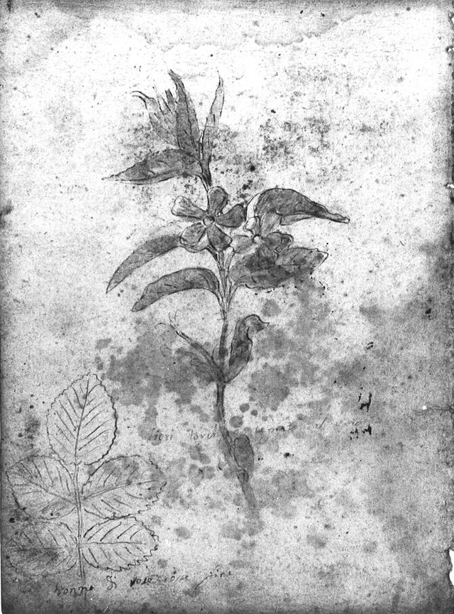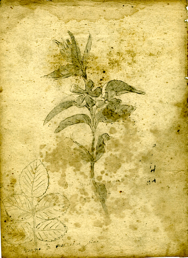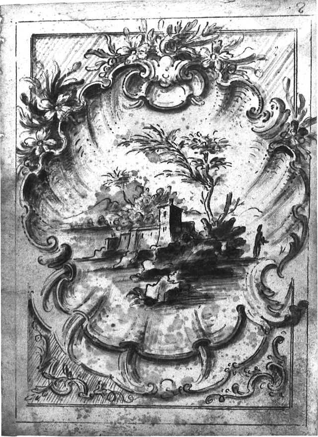 Il foglio di taccuino è disegnato su entrambi i lati. Recto: ampia cornice costituita da una conchiglia nella quale è inserito un paesaggio con masseria turrita. Verso: al centro ramo fogliato e fiorito