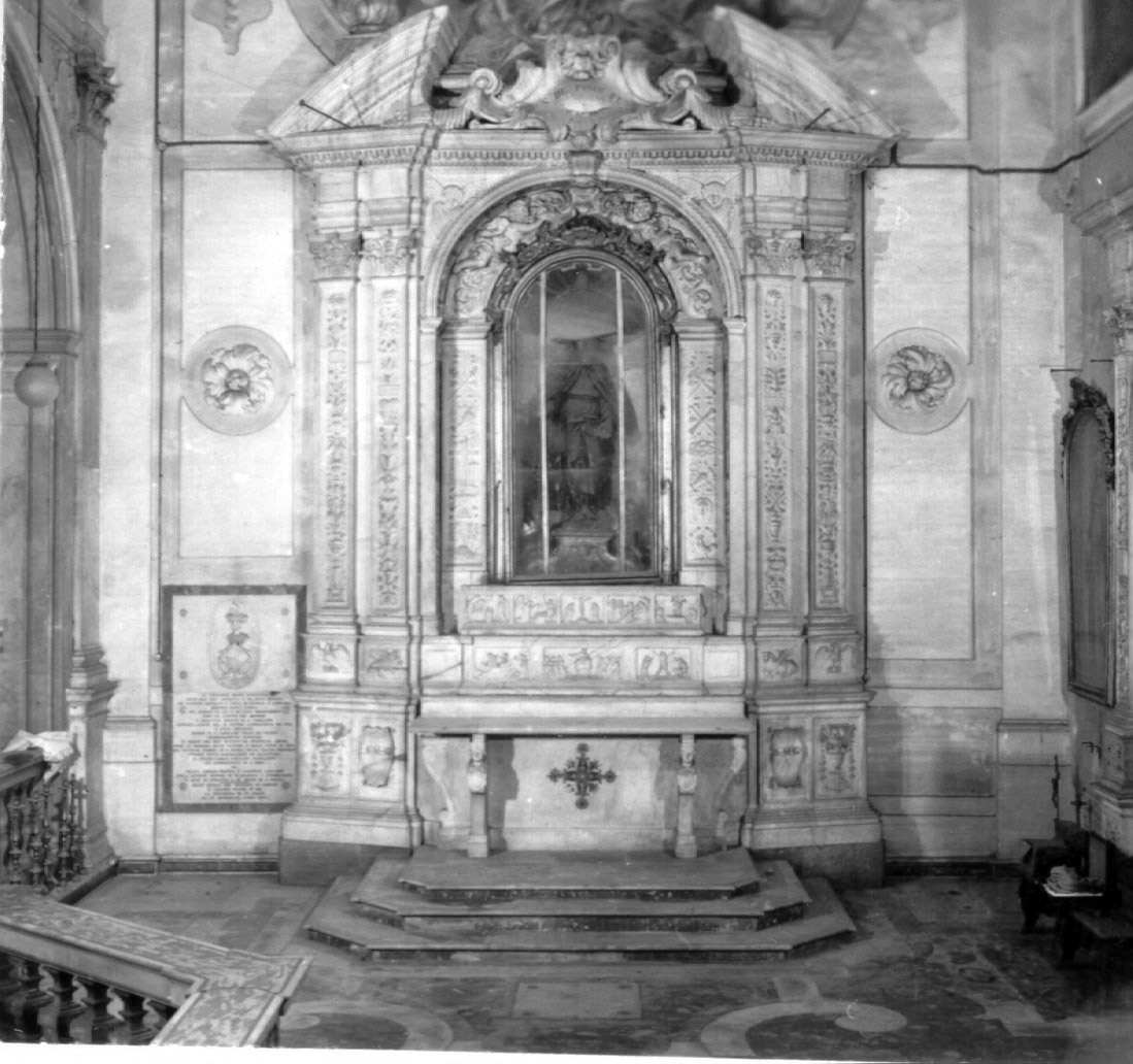 - NOTIZIE STORICO CRITICHE Fu fatto costruire così da Giovanni Gattinio, priore del monastero nel 1702, fino a quell'anno c'erano due altari, uno degli eredi di Giacomo Scarano, l'altro di vari proprietari che lo cedettero nel 1702 al monastero (Padiglione p. 185). per il disegno borrominiano, si collega alla cultura seicentesca. I puttini di stucco sono analoghi a tutta la decorazione in stucco della chiesa. La parte superiore della cona è sovrapposta al dipinto di Beinaschi