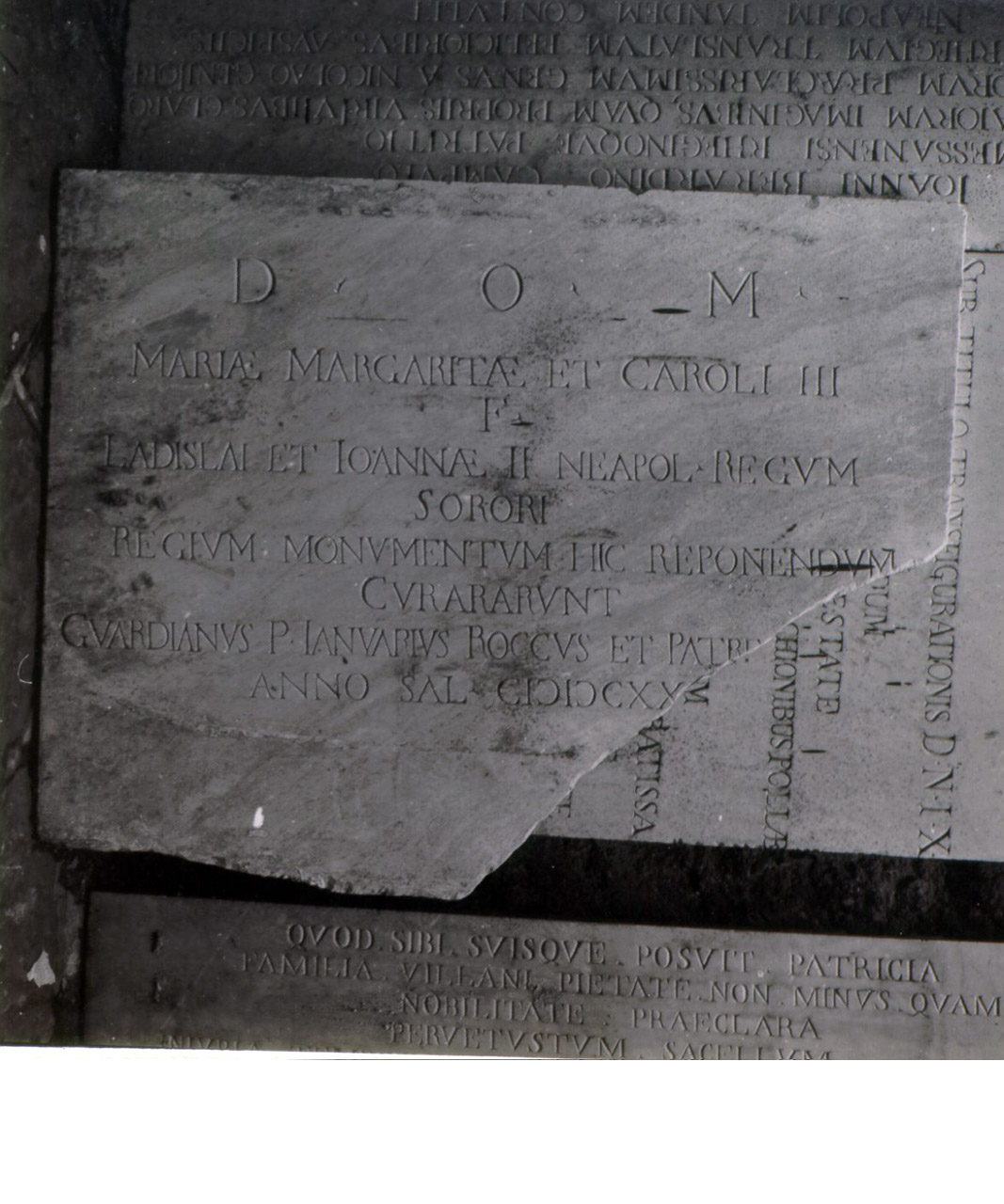 - ISCRIZIONI D.O.M./ MARIAE MARGARITAE ET CAROLI III/ F./ LADISLAI ET IOANNAE II NEAPOL REGUM/ SORORI/ REGIUM MONUMENTUM HIC REPONENDUM/ CURARARUNT/ GUARDIANUS P. IANUARIUS ROCCUS ET PATRE (...)/ ANNO SAL MDCXX (...) - latino