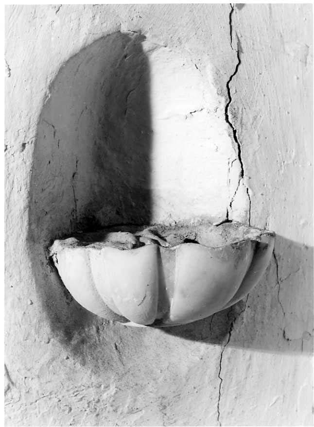 L'acquasantiera è a forma di conchiglia e decorata internamente a volute