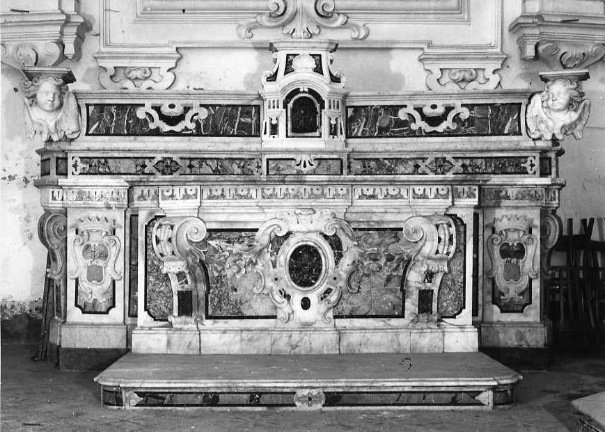 Preceduto da un gradino, presenta al centro del paliotto un medaglione decorato da fregi marmorei e festoni di frutta raccordati a volute; ai lati sono due stemmi coronati con la sigla della chiesa; il dossale, includente il tabernacolo marmoreo con portella in ottone e festigio, termina alle estremità con due cherubini sormontati da basi di appoggio. Negli stemmi ai lati del paliotto è intarsiata una scritta
