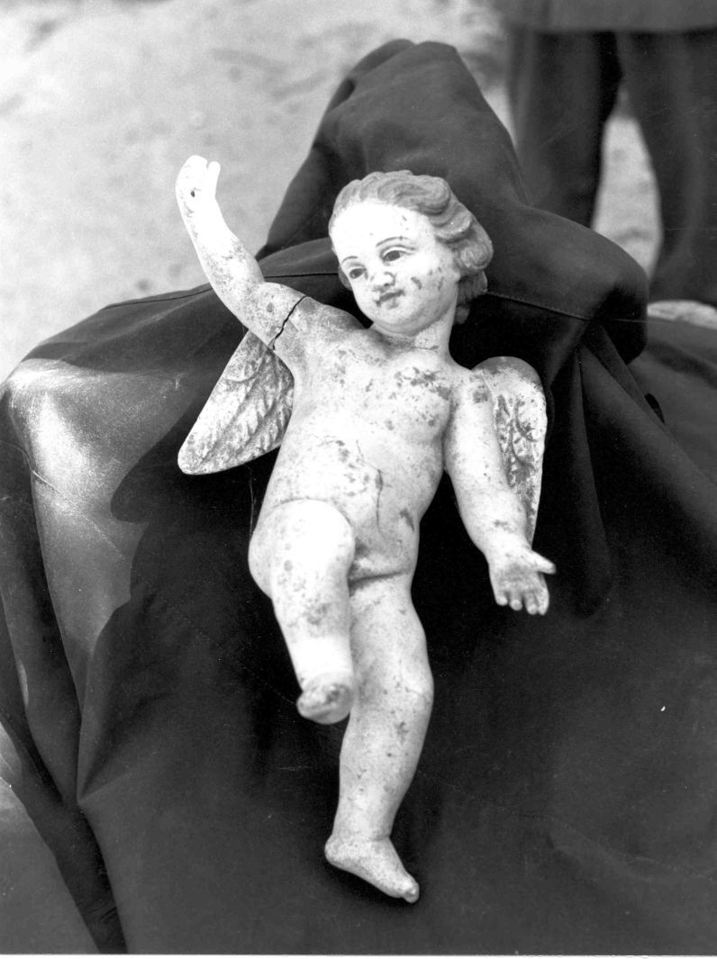 - NOTIZIE STORICO CRITICHE L'angelo veniva sospeso sul presepe durante l'esposizione per le feste natalizie. I tratti del volto, sopratutto il taglio degli occhi, richiamano gli angeli dipinti dal Vigilante, presenti nella zona di Aterrana. L'angelo potrebbe essere stato realizzato dal Vigilante, ma questa è solo una ipotesi