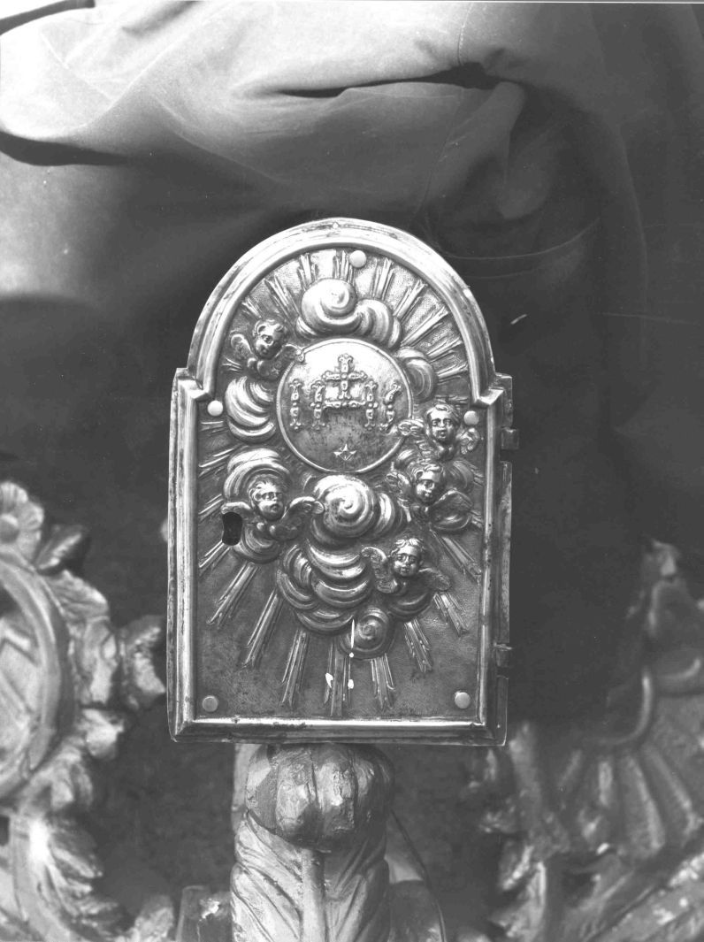 Lo sportello di tabernacolo è centinato. I cherubini, le nuvole, i raggi e le lettere decorano lo sportello. Il fondo è zinigrato e solo i volti dei cherubini sono completamente lisci