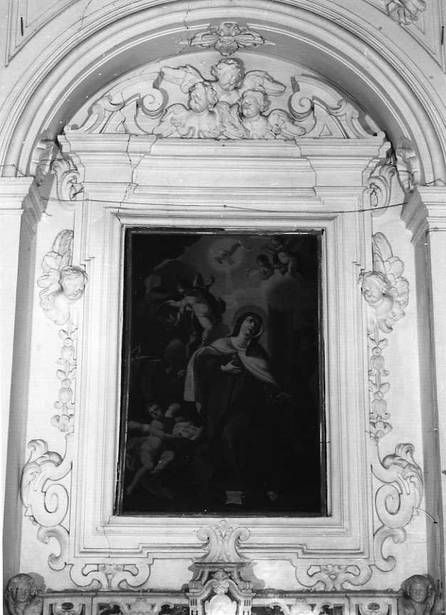 Cornice in stucco decorata con volute, motivi floreali e teste di angeli. In alto frontone spezzato con al centro gloria di angeli