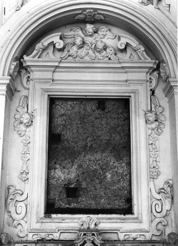 Cornice a timpano in stucco incorniciante un dipinto. Cornice scanalata con motivi decorativi in basso a volute, in alto floreali e teste di angeli. In alto sotto il timpano, frontone spezzato con al centro gloria di angeli