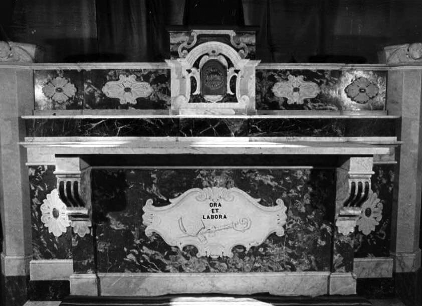 Struttura geometrizzante con colonne esagonali, sormontate da basi con cherubini, ai due lati esterni. Motivi fioracei sulla mensa superior ; insegna benedettina sul paliotto