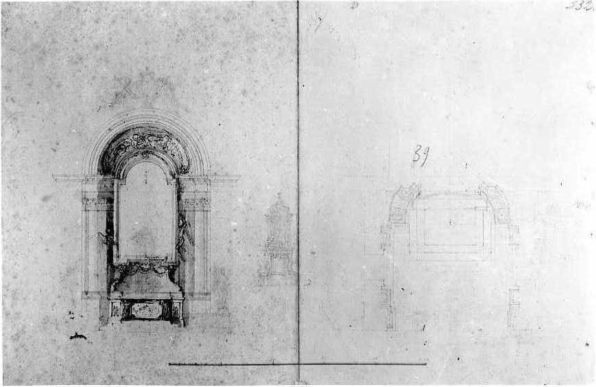 Il cartone unico contiene a sinistra il prospetto, a destra la pianta. L'altare è di semplice forma parallelepipeda con due angeli che reggono il paliotto, è formalmente legato alla cornice della tela tramite un motivo decorativo; la pala è sorretta da due angeli; nel catino absidale putti alati, a destra è abbozzato a matita un angelo reggi-candela. Al centro del foglio, oltre alla scala grafica, vi è un alto ciborio posto sopra l'altare, disegnato a matita.La pianta è sostanzialmente identica a quella del progetto precedente, le piccole differenze consistono nelle colonne che sono di diametro maggiore e quindi più ravvicinate, aumentando la profondità dell'abside. Una parasta per lato chiude la cappella. A matita sono ipotizzate sia la balaustra esterna sia lo stemma sul pavimento