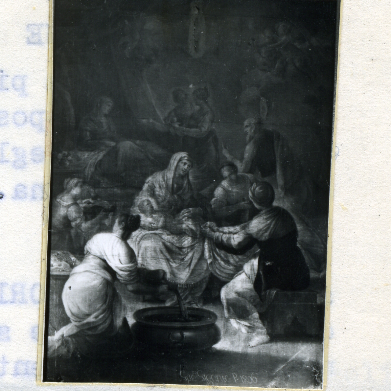 - NOTIZIE STORICO CRITICHE La presenza della firma convalida l'attribuzione del dipinto a Gaetano Gigante, effettuata dal Galante. Il Gigante era definito dal Carelli "nediocre pittore, ma ottimo affrescante pel prestigio del colorito". Il Carelli sosteneva, inoltre, che l'artista, "atteso i tempi, la sua numerosa famiglia e la povertà, non potè conseguire quegli studi che si addicono ad un pittore monumentale e di scienza", ed affermava: "forse con migliori mezzi sarebbe salito ad alta fama". E' così, il pittore, ne "La nascita della Vergine", pur rivelando una certa padronanza di mezzi e dimnostrando una particolare attenzione al fattore coloristico, tuttavia realizza una composizione alquanto sommaria nella trattazione del dato cromatico e delle singole figure, che risultano, nella loro monumentalità, convenzionali ed atteggiate in pose teatrali