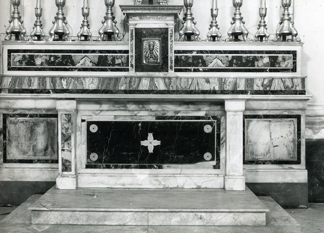 Due reggimensa decorati a commesso inquadrano il paliotto, decorato da marmi applicati a lastre; pilastrini laterali, predella a doppio gradino e ciborio quarangolare decorati con lastre di marmi policromi