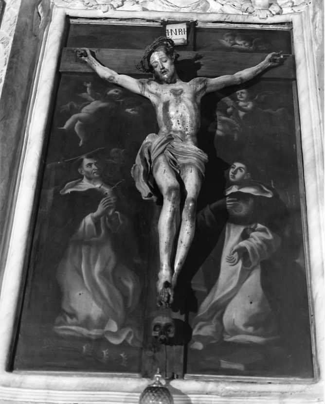In basso a sinistra San Pietro Martire, a destra San Tommaso inginocchiati. In alto, sulle nuvole, angeli