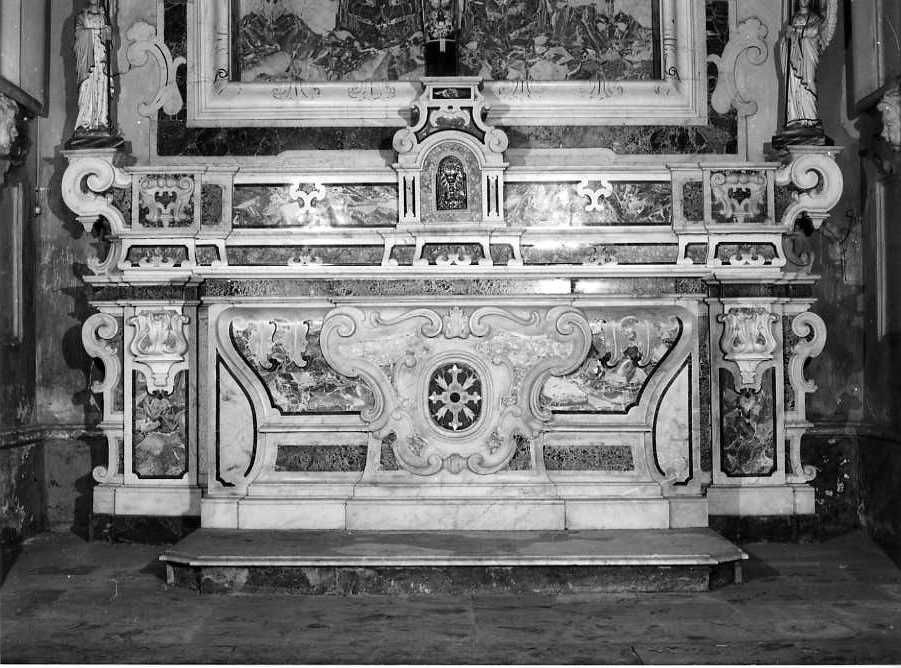 Altare di marmi commessi policromi con ciborio a tempietto con porta di tabernacolo.Decorazione fitomorfa.Volute ai capi-altare