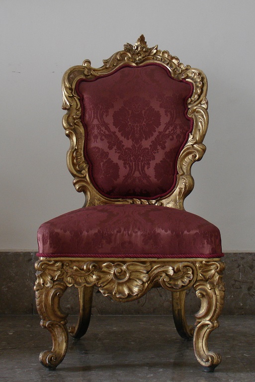 Le dua gambe anteriori sono doppiamente incurvate, con piedino a ricciolo e decorazione a motivo vegetale. Le due gambe posteriori sono a sciabola, con piedino a ricciolo. La fascia è decorata da motivi conchigliformi. La guida e la traversa superiore di schienale sono mistilinee, con una decorazione a motivo vegetale. Il rivestimento è in tessuto di colore rosso