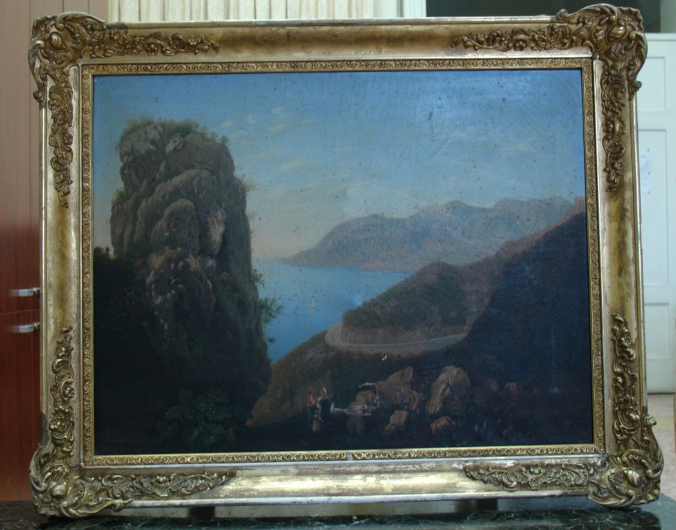 Paesaggio marino caratterizzato sulla sinistra, in primo pino, da un alto sperone di roccia e a sinistra da altre montagne. Al centro tre figure. Sul mare una barca con la vela spiegata