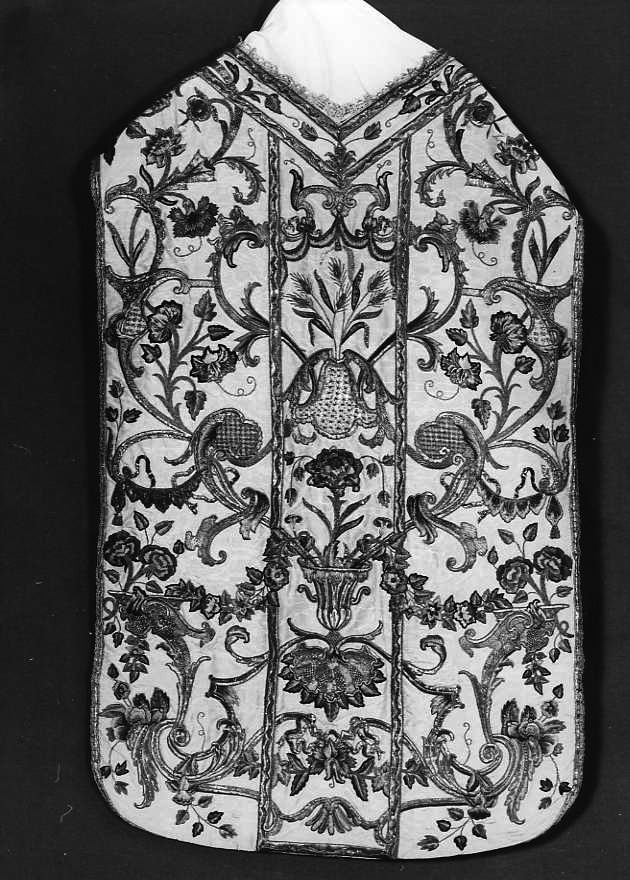 La pianeta è in moirè bianca completamente ricamata in oro e seta