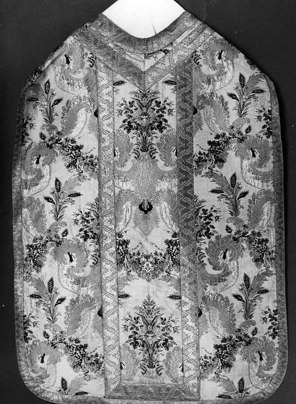 Il paramento è confezionato con un tessuto di seta in lamina d'argento, decorato con fogliami in filo d'oro e seta