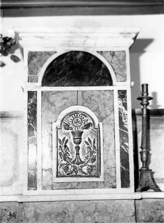 Sportello di tabernacolo in sottile lamina dorata su cui è raffigurato in bassorilievo il calice e l'ostia consacrata. In basso spighe di grano
