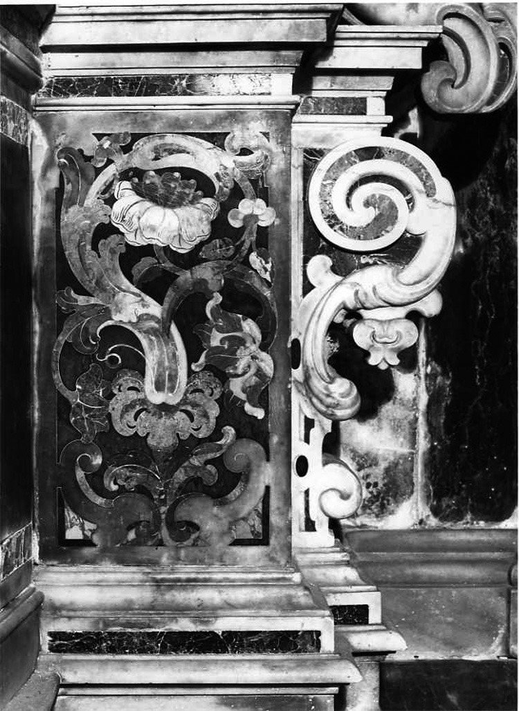 Basamento d'altare in marmo intarsiato raffigurante fiori che si innalzano da volute