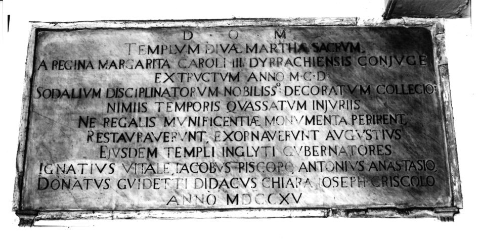 - ISCRIZIONI D.O.M./ TEMPLVM DIVA MARTHA SACRVM/ A REGINA MARGARITA CAROLI III DYRRACHIENSIS CONJUGE/ EXTRVCTUM ANNO M.C.D./ SODALIVM DISCIPLINATORVM NOBILIS DECORATVM COLLEGIO/ NIMIIS TEMPORIS QVASSATVM INJVRIIS/ NE REGALIS MVNIFICENTIAE MONVMENTA PERIRENT/ RESTAVRAVERUNT EXORNAVERVNT AVGVSTIVIS/ EJVSDEM TEMPLI INGLJTI GVBERNATORES/ IGNATIVS PISCOPO ANTONIVS ANASTASIO/ DONATUS GUIDETTI DIDACUS CHIARA IOSEPH CRISCOLO/ ANNO M D C C X V -