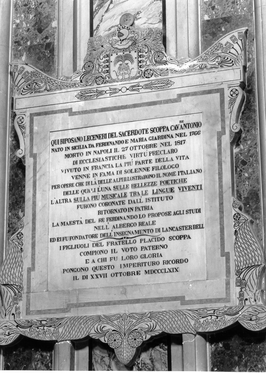 - ISCRIZIONI QUI RIPOSANO LE CENERI DEL SACERDOTE SCOPPA CAV.RE ANTONIO/ NATO IN SICILIA DA FERDINANDO E MARIA GIARDINIA NEL 1766/ MORTO IN NAPOLI IL 27 OTTOBRE NEL 1817/ DI ECCLESIASTICHE VIRTU' PRECLARO/ VIVUTO IN FRANCIA LA PIU' PARTE DELLA VITA/ VENNE IN FAMA DI SOLENNE FILOLOGO/ PER OPERE CHE DI LA' DELLE API ILLUSTRARONO IL NOME ITALIANO/ DELLE QUALI L'UNA SULLE BELLEZZE POETICHE L'ALTRA SULLA PIU'MUSICALE TRA LE LINGUE VIVENTI/ FURONO CORONATE DALL'ISTITUTO/ RITORNATO IN PATRIA/ LA MAESTA' DEL RE FERDINANDO LO PROPOSE AGLI STUDI/ NELL'ALBERGO REALE/ ED EI FU FONDATORE DELL'INSEGNAMENTO DI LANCASTER BELL/ I FIGLIUOLI DEL FRATELLO PLACIDO SCOPPA/ COMPIONO IL VOTO PATERNO/ E A CHI FU LORO GLORIA/ PONGONO QUESTO IMPERITURO RICORDO/ IL DI XXVII OTTOBRE MDCCCLXIX -