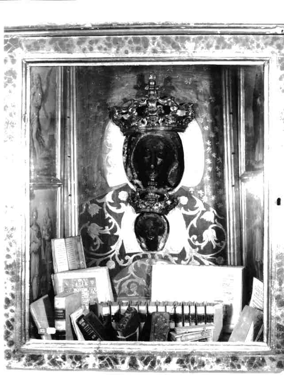 - NOTIZIE STORICO CRITICHE L'altorilievo mostra, per quanto poco sia possibile leggerlo, i segni di una fissità di matrice bizantina, aperto però, nel volto della Vergine quasi sorridente e nell' acconciatura da pagetto del Bambino, alle influenze gotiche porovenienti d'oltralpe. L'ambito di riferimento potrebbe essere lo stesso della Vergine con Putto conservata presso lo stesso luogo. Inoltre, da notizie sul restauro di quest'ultima (1950) sappiamo che il volto, anche in quel caso completamente annerito, una volta restaurato ha restituito parte della policromia originale; è lecito supporre che ciò potrebbe avvenire anche in questo altorilievo
