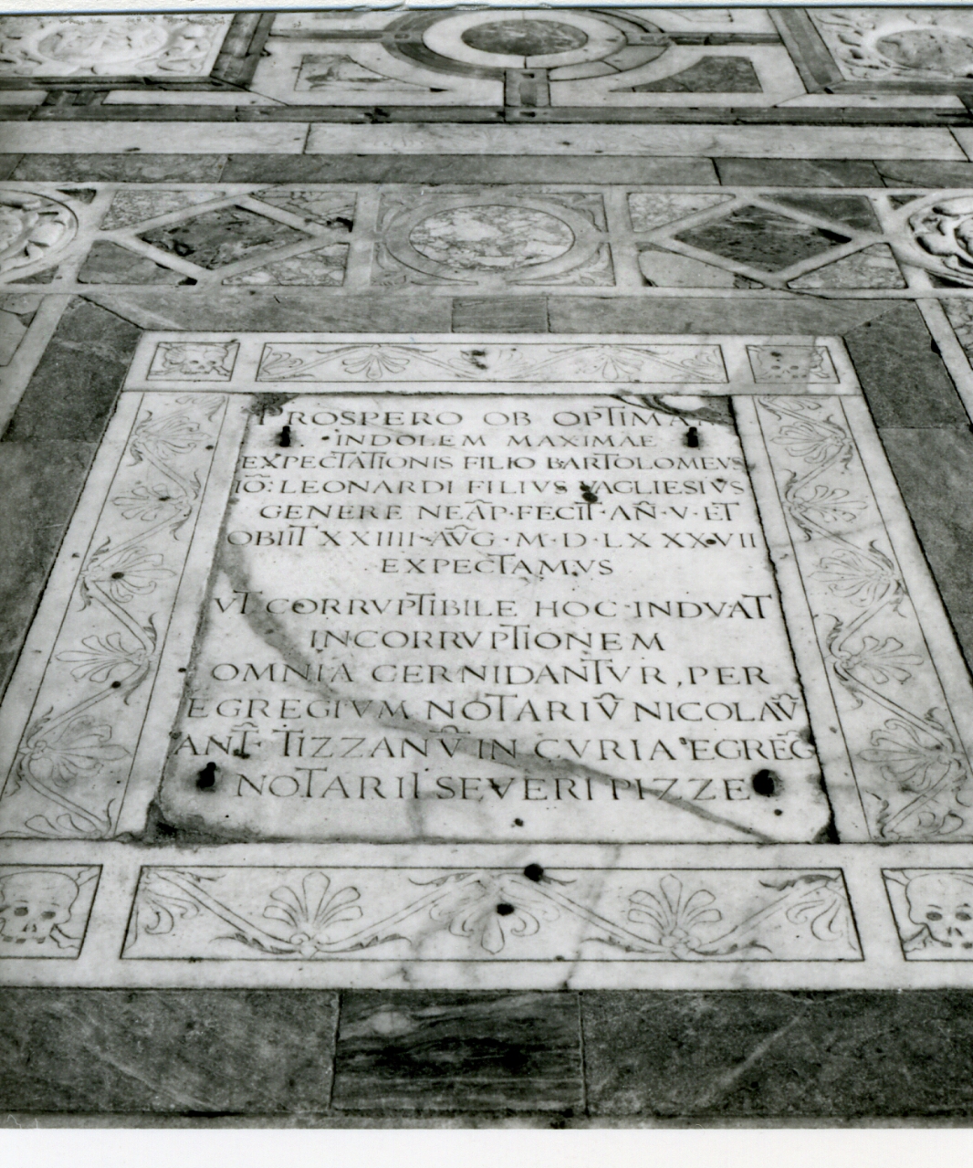 - ISCRIZIONI PROSPERO OB OPTIMAM/ INDOLEM MAXIMAE/ EXPECTATIONIS FILIO BARTOLOMEUS/ IO: LEONARDI FILIUS VAGLIESIUS/ GENERE NEAP. FECIT AN. V. ET/ OBIIT XXIIII AUG. M.D. LXXXVII/ EXPECTAMUS/ UT CORRIPTIBILE HOC INDUAT/ INCORRUPTIONEM/ OMNIA CERNIDANTUR, PER/ EGREGIUM NOTARIU NICOLAU/ ANT. TIZZANU IN CURIA EGREG./ NOTARII SEVERI PIZZE - lettere capitali -