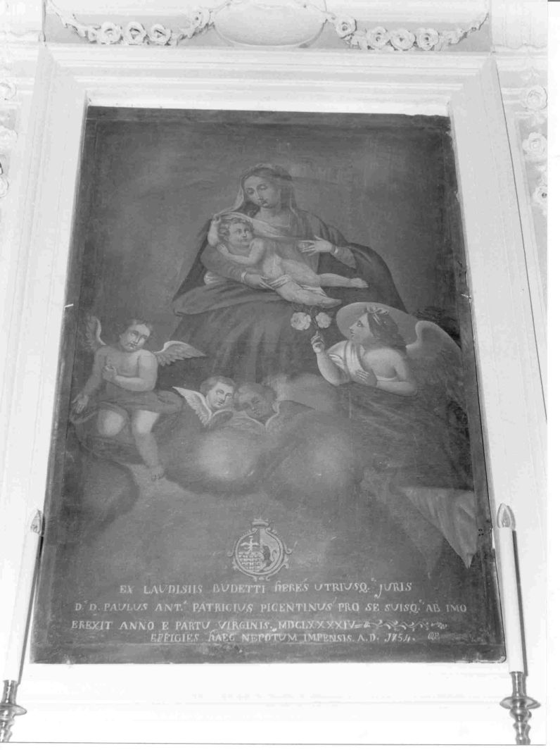 - ISCRIZIONI in basso, al centro - EX LAUDISIIS BUDETTI HERES UTRIUSQ.E JURIS/ D. D. PAULUS ANT. PATRICIUS PICENTINUS PRO SE SUISQ.E AB IMO/ EREXITANNO E PARTU VIRGINIS. MDCLXXXXIV/ EFFIGIES HAEC NEPOTUM IMPENSISI. A. D. 1854 AP -