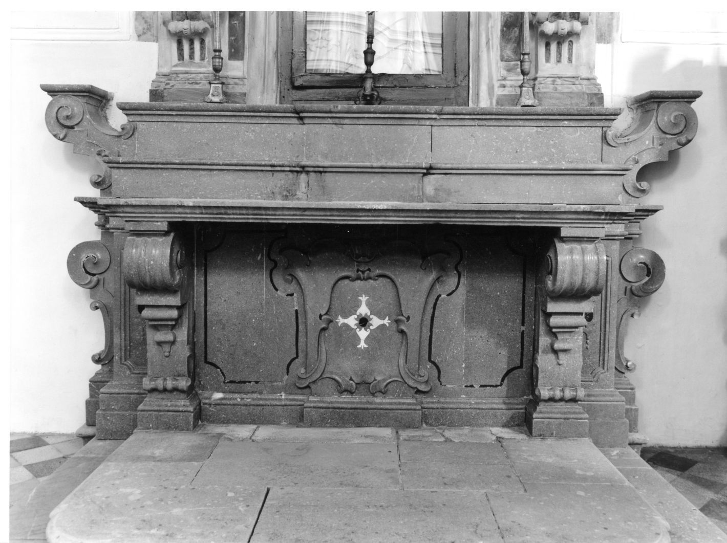 Il dossale è caratterizzato dalla presenza di due volute laterali. La mensola sporgendo poggia su due ampie volute scanalate. La facciata principale è decorata da un delicato motivo che racchiude una croce