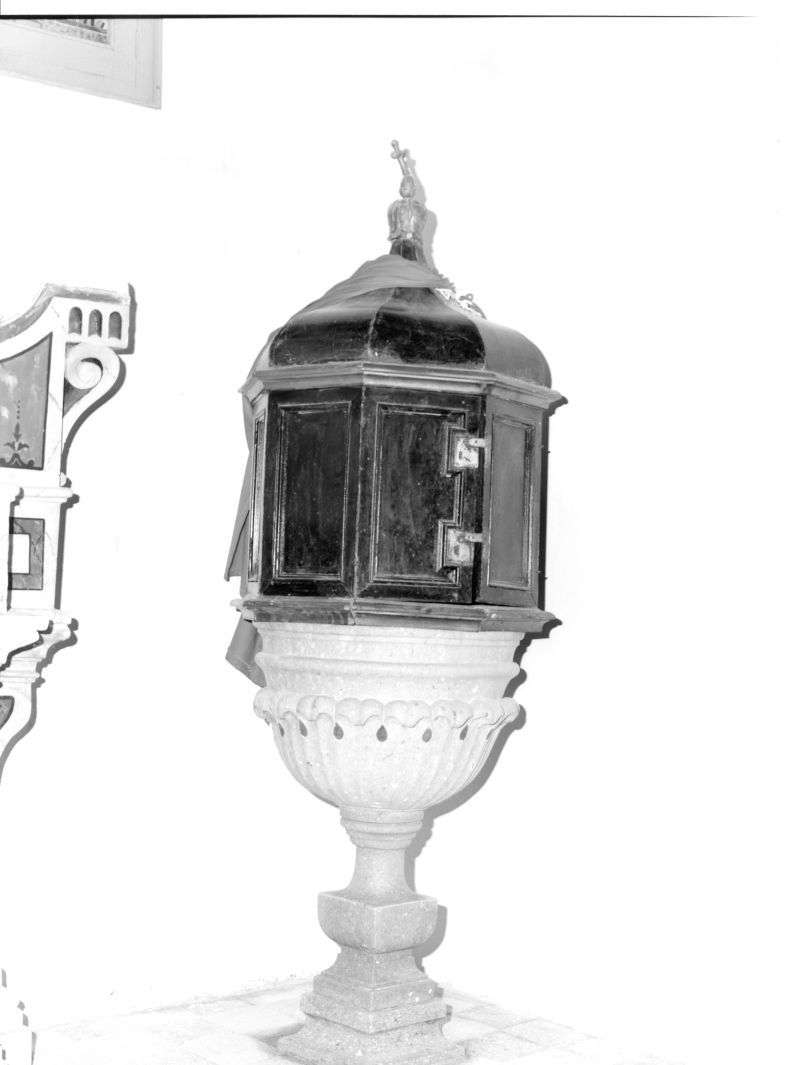 Suddivisa in due parti la fonte è costituita da un corpo superiore in legno dipinto sormontato da una croce e da una parte inferiore in pietra con decorazioni a motivi vegetali stilizzati. La base, sempre in pietra, è meno decorata rispetto alla vasca vera e propria