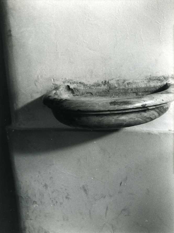 Acquasantiera in marmo grigio con labbro sporgente ed una scanalatura al di sotto