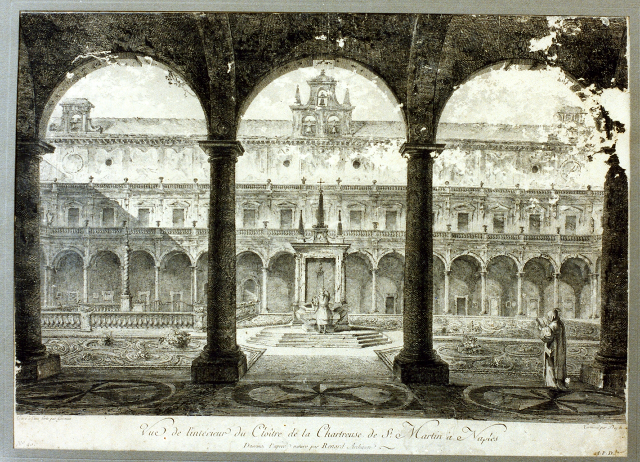 - ISCRIZIONI in basso al centro - VUE DE L'INTERIEUR DU CLOITRE DE LA CHARTREUSE DE ST. MARTIN A NAPLES -