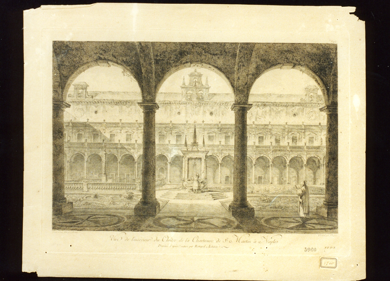 - ISCRIZIONI in basso al centro - VUE DE L'INTERIEUR DU CLOITRE DE LA CHARTREUSE DE ST. MARTIN A NAPLES - francese