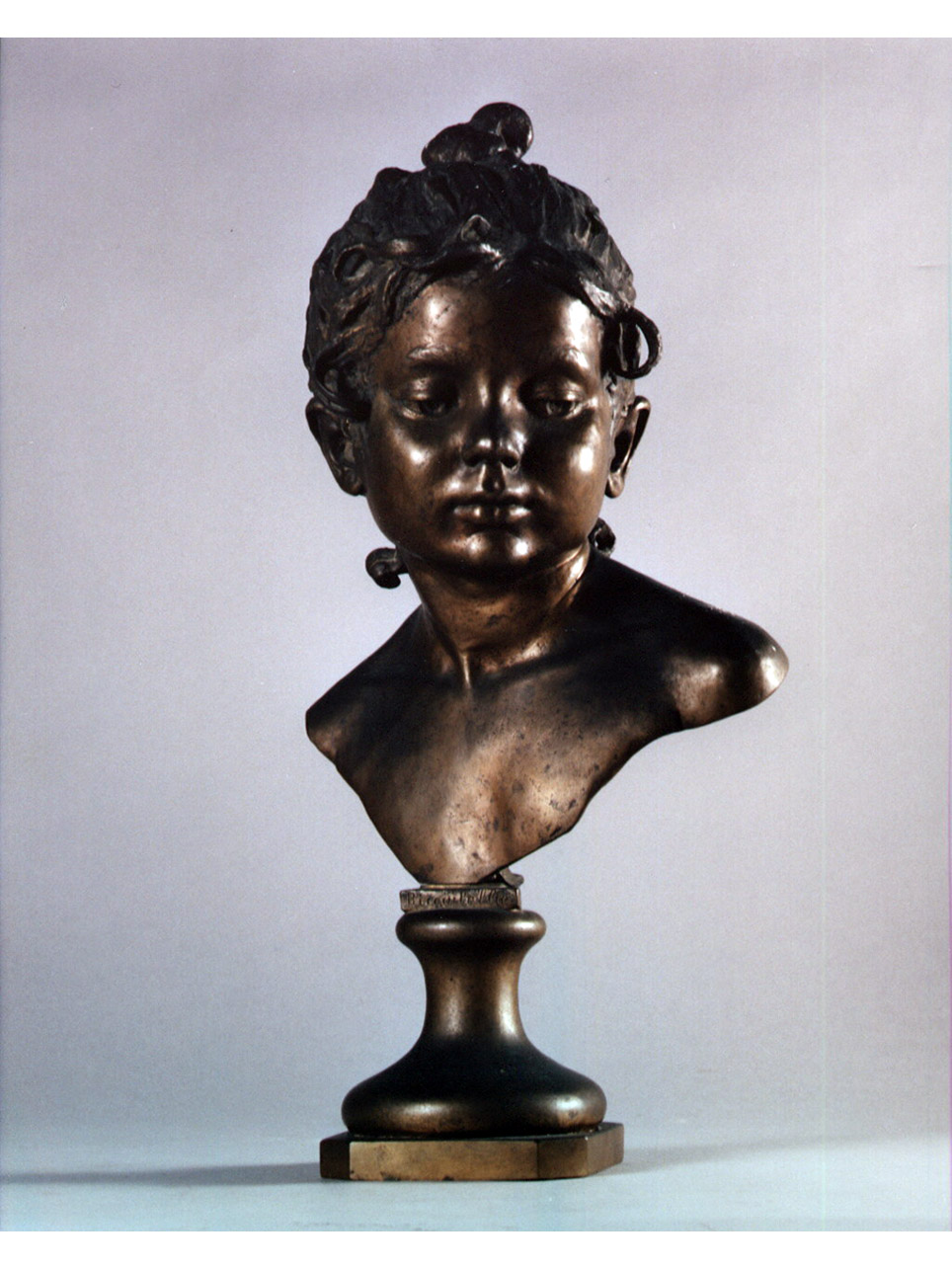 Il busto su piedistallo è fissato alla base tramite un perno filettato. La scritta è incisa su una tabella rettangolare saldata alla base