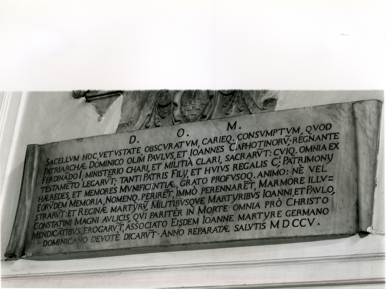 - ISCRIZIONI D.O.M./ SACELLUM HOC VETUSTATE OBSCURATUM CARIEQU CONSUMPTUM QUOD/ PATRIARCHAE DOMINICO OLIM PAULUS ET IOANNES CAPHOTINORUM; REGNANTE/ FERDINANDO I MINISTERIO, CHARI, ET MILITIA CLARI SACRARUNT: CUIQ OMNIA EX/ TESTAMENTO LEGARUNT TANTI PATRIS FILY ET HUIUS REGALIS CS; PATRIMONY/ HAEREDES ET MEMORES MUNIFICENTIAE GRATO PROFUSOQ. ANIMO: NE VEL/ EORUNDEM MEMORIA, NOMEQ. TERIRENT, IMMO PERENNARENT, MARMORE ILLU/ STRARUNT: ET REGINAE MARTYRU, MILITIBUSQUE MARTYRIBUS IOANNI ET PAULO, / CONSTATINI MAGNI AULICIS, QUI PARITER IN MORTEM OMNIA PRO CHRISTO/ MENDICANTIBUS EROGARUNT, AFFOCIATO EISDEM IOANNE MARTYRE GERMANO/ DOMINICANO DEVOTE DICARUNT. ANNO REPARATAE SALUTIS MDCCV -