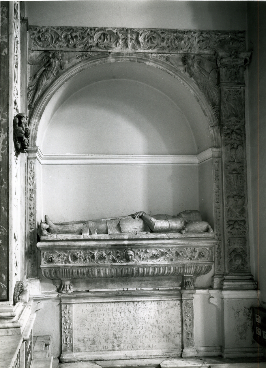 - ISCRIZIONI IACOBOTIO DE ALEXANDRO/ EX NOBILITATE NEAPOLITANA/ TEMPESTA SUA PLURIUM/ CASTELLORUM DOMINO QUI/ FERDINANDO REGI LONGE INTIMUS/ PLURIMA DOMI MILITIAEQUE/ SERVITIA PRAESTITIT/ ROBERTUS FILIUS PATRI D.M. POSUIT/ OBIIT AN. MCCCLXXXII/ DIE V SEPTEMBRIS - latino
