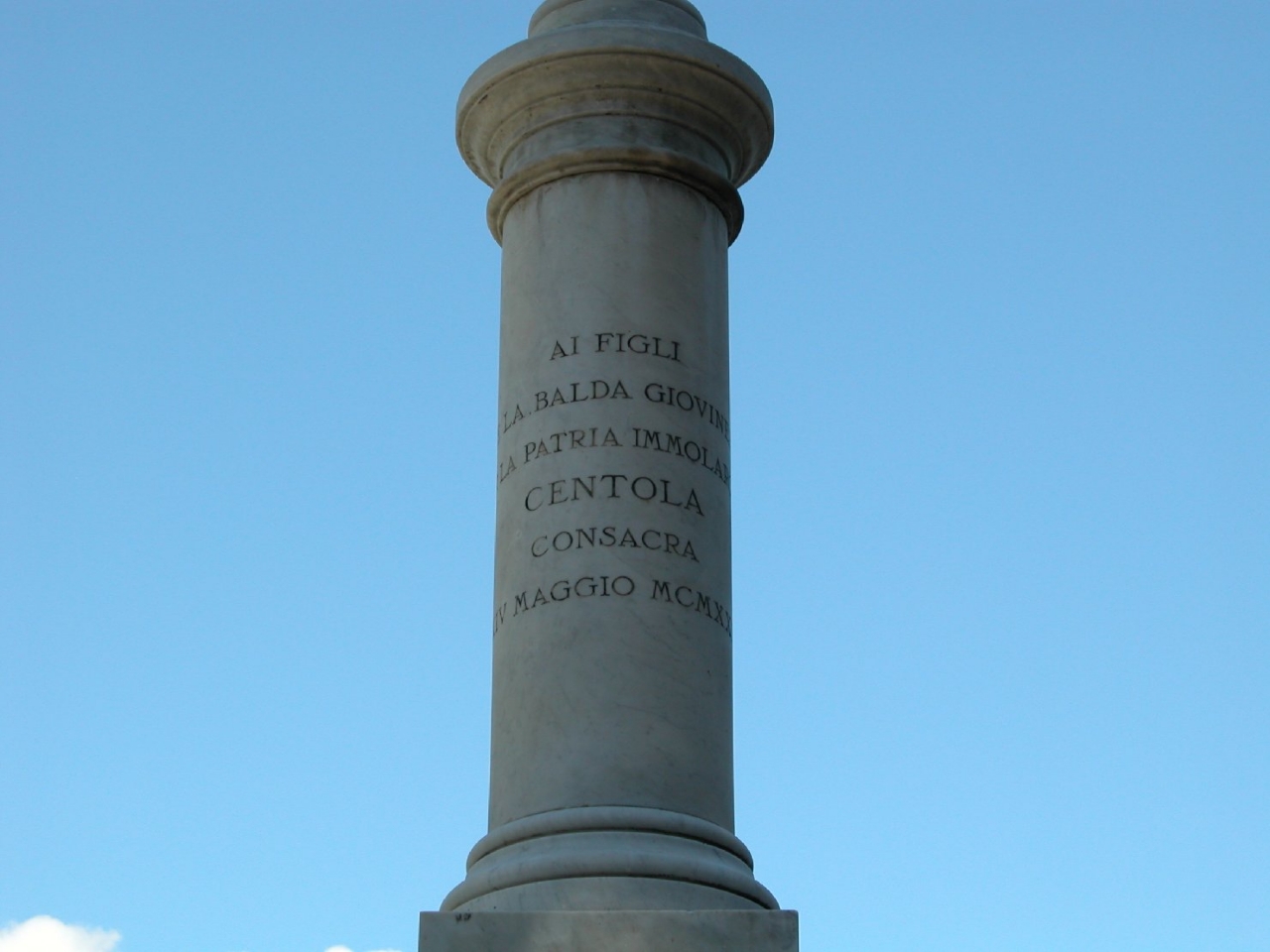 - ISCRIZIONI colonna/ lato anteriore/ al centro - AI FIGLI/ CHE LA BALDA GIOVINEZZA/ ALLA PATRIA IMMOLARONO/ CENTOLA CONSACRA/ MAGGIO MCMXXIV// - lettere capitali -